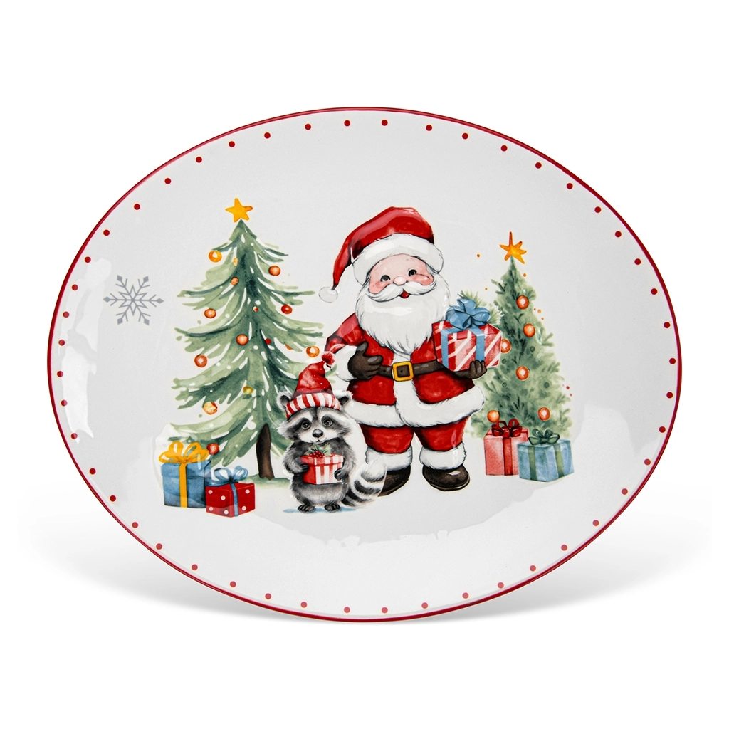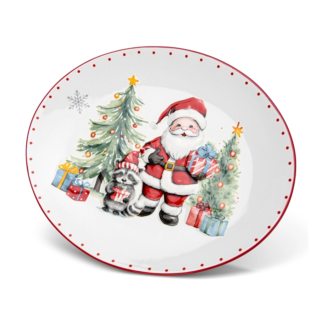 Изображение Деда Мороза, ёлок, подарков и снежинок выполнено с объёмным эффектом - это не просто рисунок, а настоящее произведение декоративного искусства. Рельеф придаёт блюду роскошный и праздничный вид, делая его центральным элементом любой сервировки.