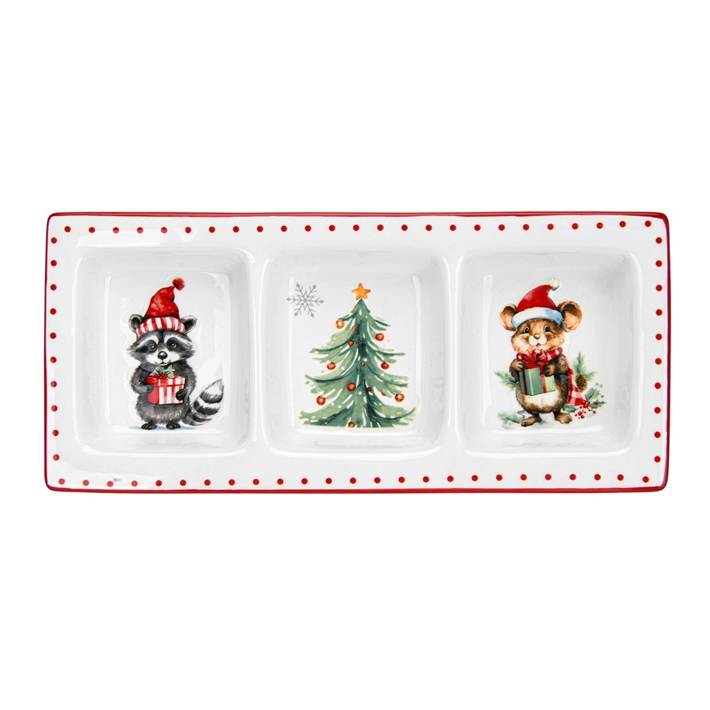 Менажница MERRY CHRISTMAS представляет собой функциональный предмет посуды, созданный для тех, кто ценит гармоничное сочетание формы, практичности и праздничного настроения. Это не просто менажница, а элемент сервировки, изготовленный из натурального материала - доломита. Она предназначена для людей, которые ценят высокое качество и продуманный дизайн.