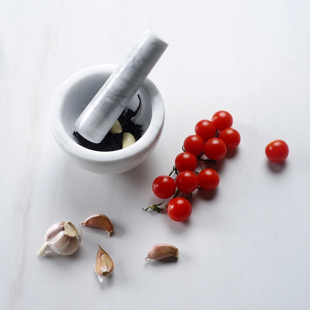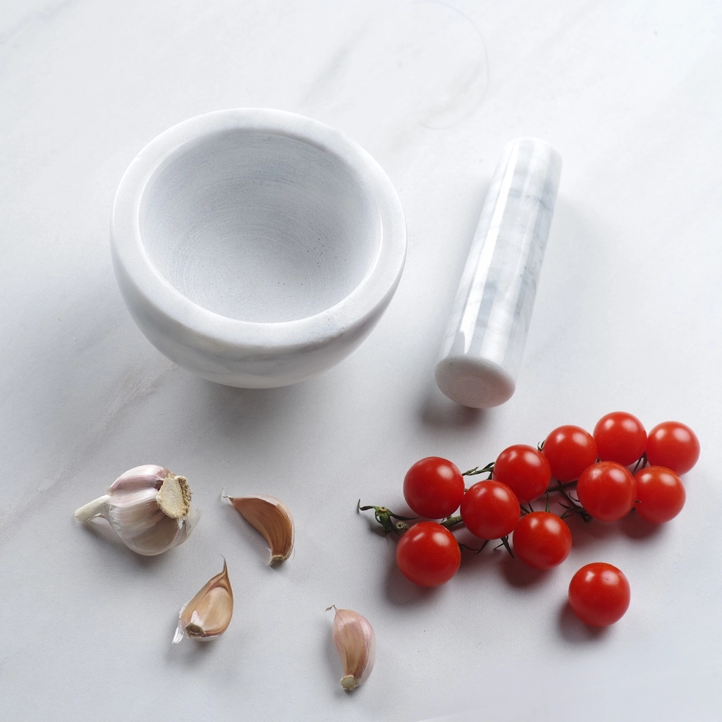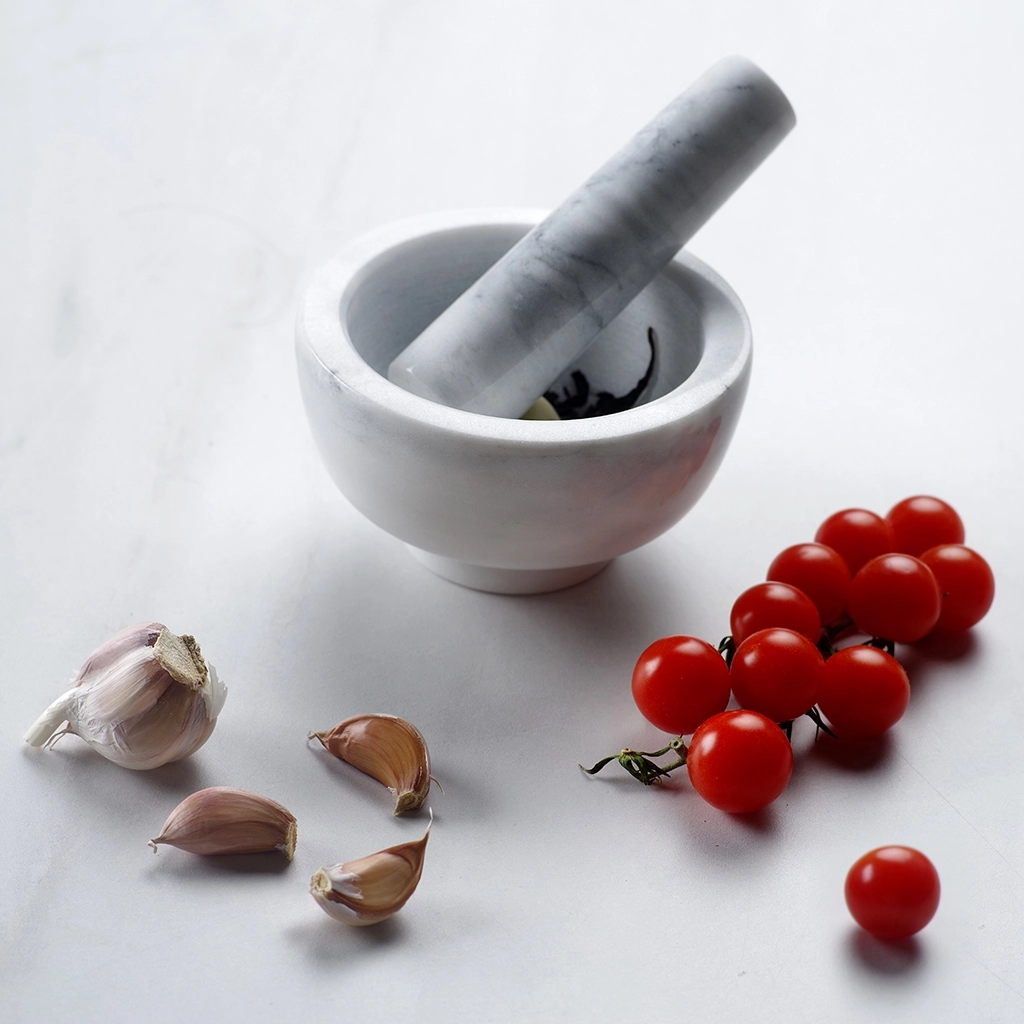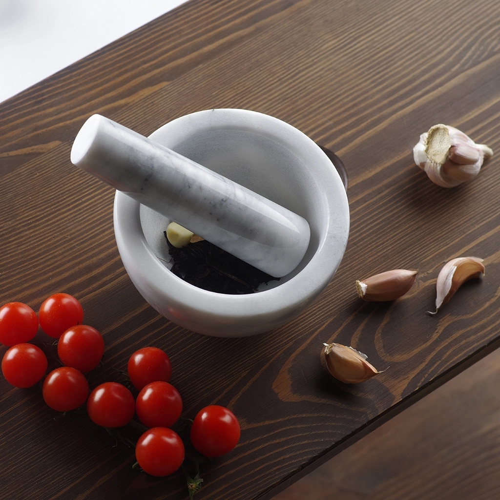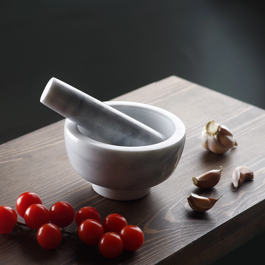 Мрамор не впитывает в себя посторонние запахи, поэтому ступку можно использовать с разными специями и приправами. Для эффективного размельчения внутренняя поверхность ступки и рабочая часть пестика шероховатая.