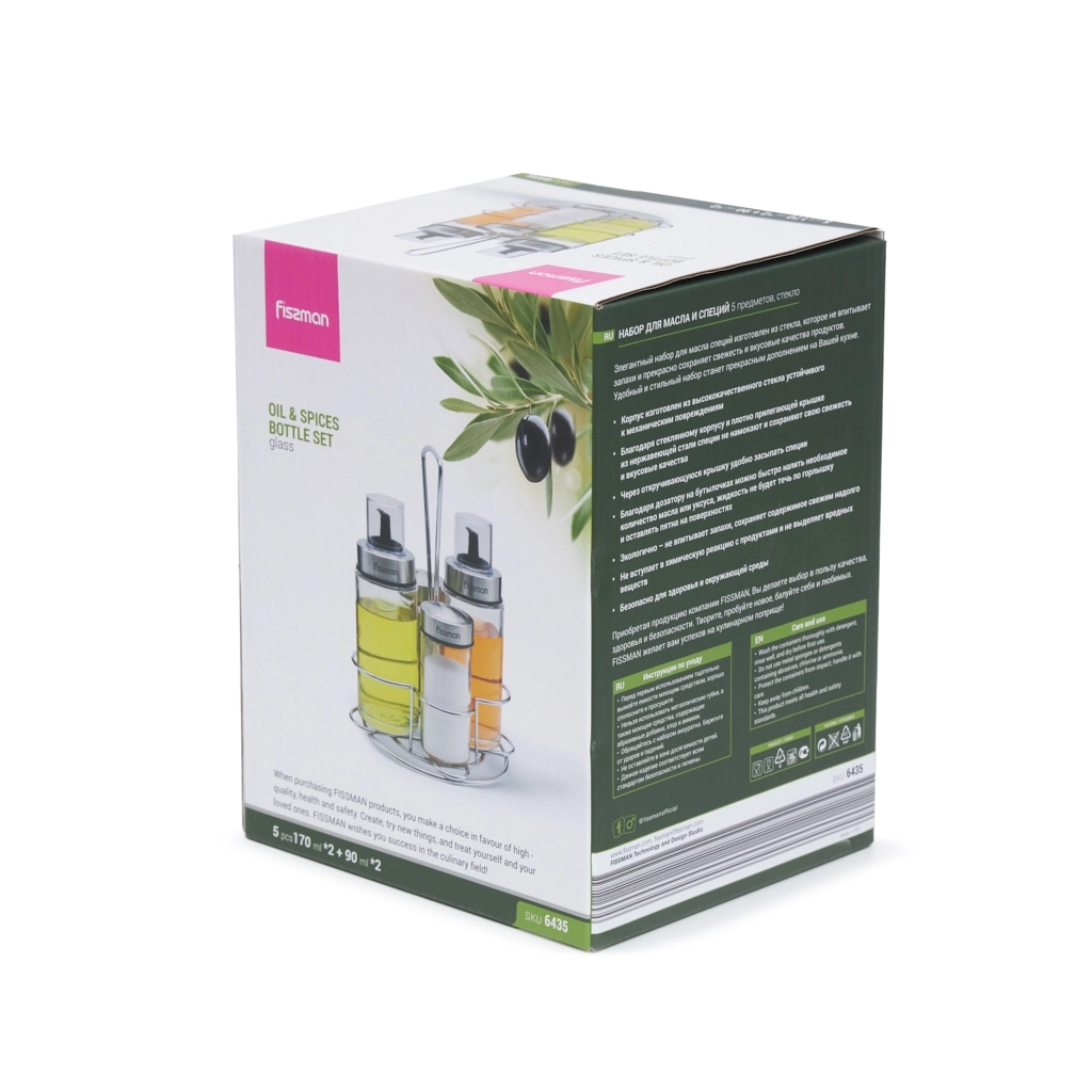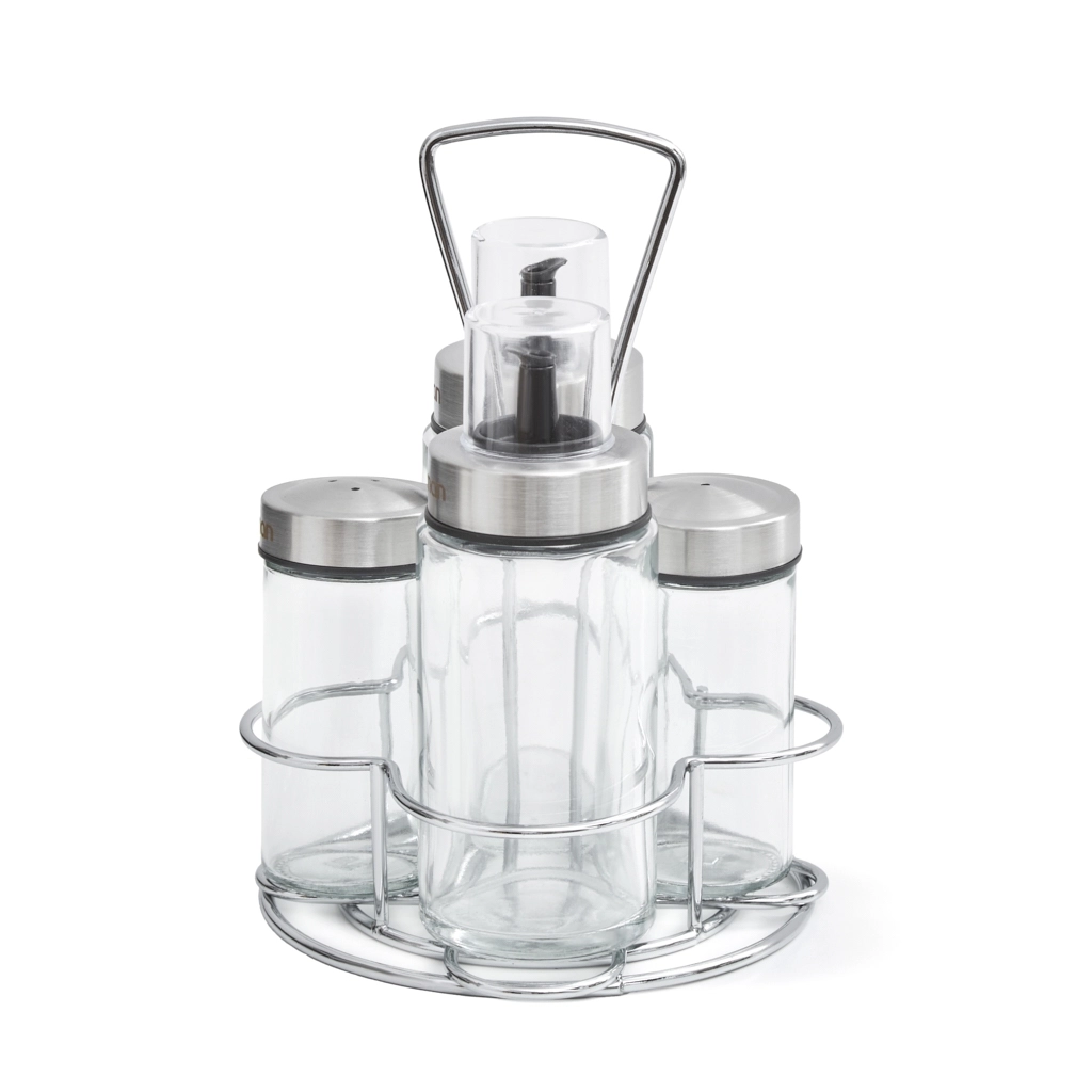Набор состоит из 2-х бутылочек для масла или уксуса 170 мл и 2-х емкостей для специй 90 мл.