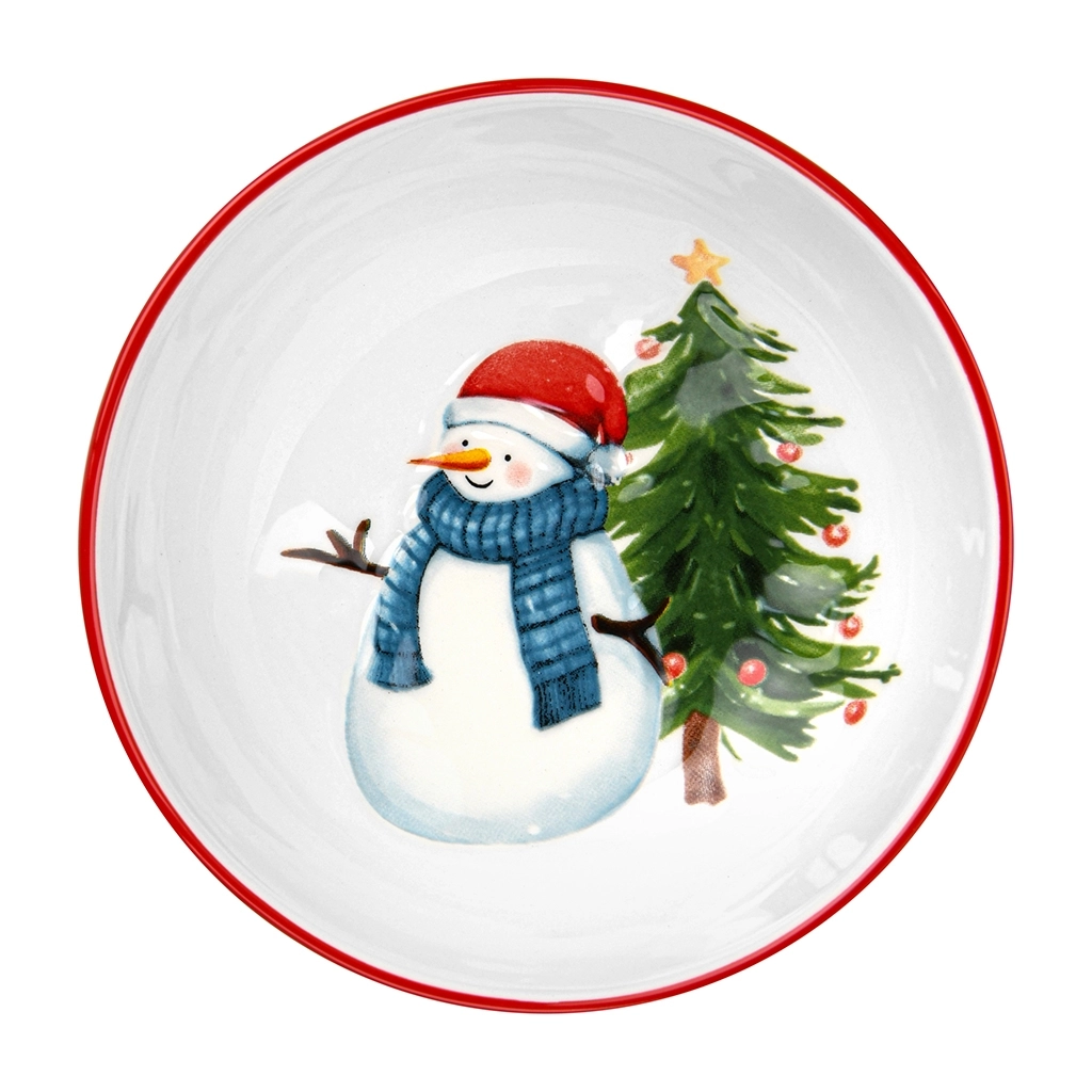 На дне миски расположено рельефное изображение снеговика и ёлки, что создаёт эффект «живого» рисунка. Рельефная поверхность позволяет ощутить рисунок пальцами и наслаждаться его красотой при каждом использовании. Красная окантовка по краю миски подчёркивает праздничную тематику и гармонично дополняет композицию. Миска создаёт праздничное настроение: уже сам факт её появления на столе вызывает тёплые эмоции и ассоциации с зимними праздниками.