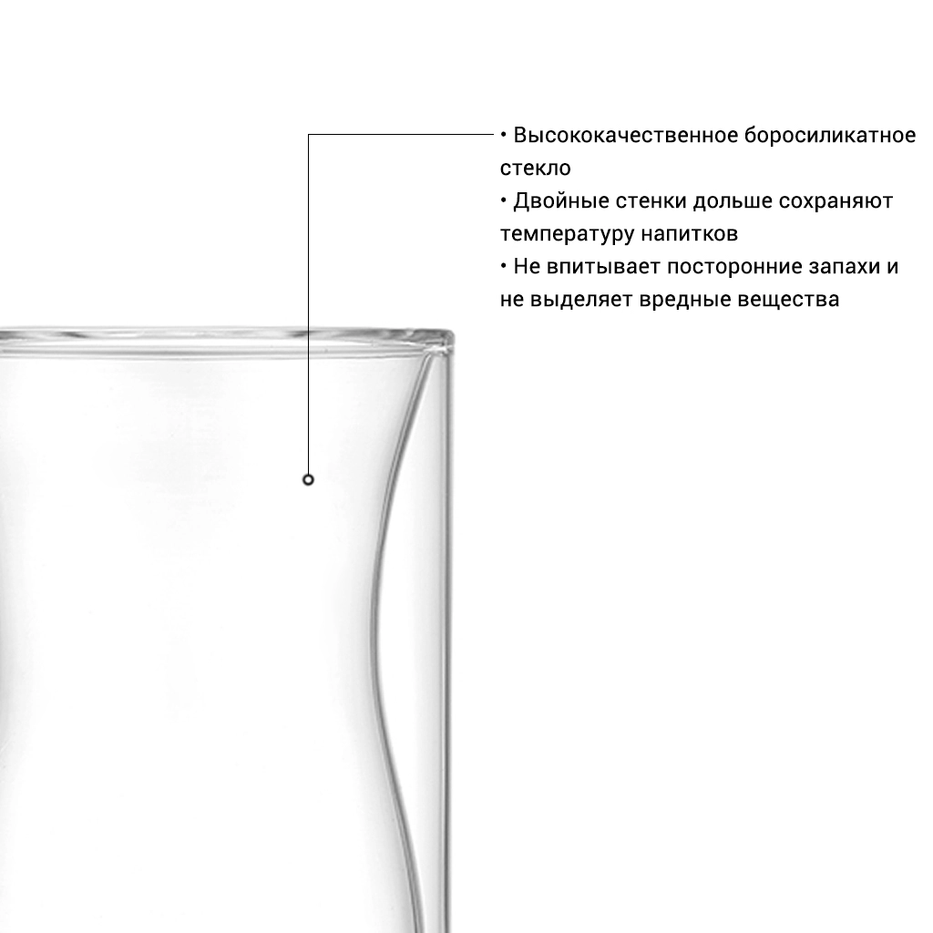 • Благодаря двойным стенкам стаканы не только дольше сохраняют температуру напитков, но и защищают руки от ожога
