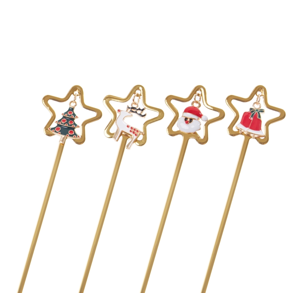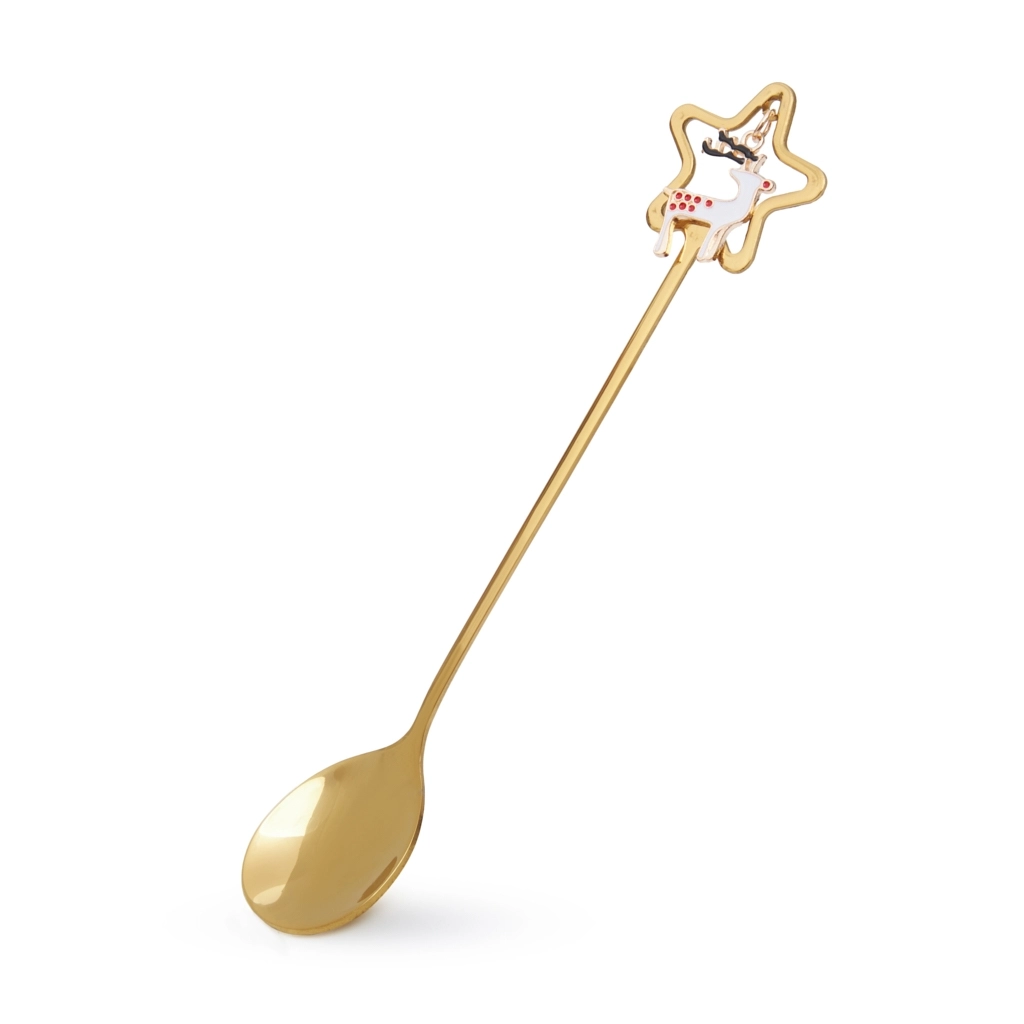 Верхушка каждого прибора оформлена в виде звезды с праздничными символами - Санта, ёлка, олень и подарок. Декор покрыт прочной эмалью, нанесённой вручную, поэтому каждый элемент немного уникален. Золотистое покрытие отражает свет свечей и гирлянд, придавая сервировке тёплое сияние. Такой набор не просто украшает стол - он задаёт праздничное настроение.