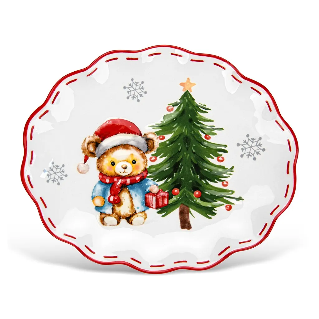 Тарелка сервировочная из https://fissman.ru/catalog/servirovka-stola/tarelki/tarelka-servirovochnaya-iz-dolomita-24-kh-20-sm-art-0380/  доломита 23 х 19 см Merry Christmas арт. 0380