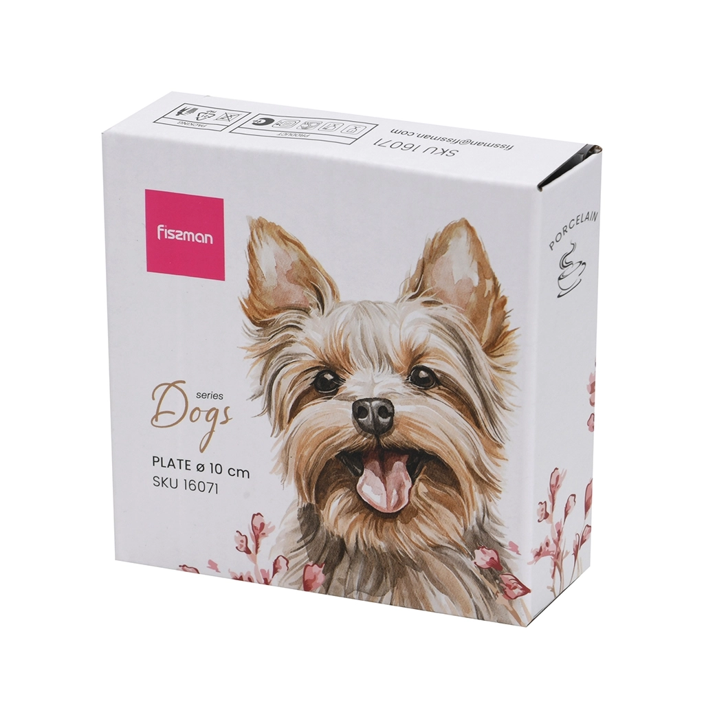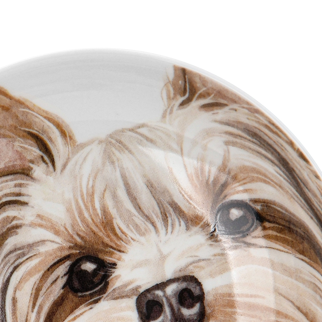Фарфоровое блюдце 10 см «Dogs» - это не просто блюдце. Это мини-галерея, которую вы держите в руках. На нём - не просто изображение собаки. Это портрет йорка: с лёгкой хитростью в глазах, пушистыми бровками и язычком, будто только что лизнувшим вам палец. Он смотрит прямо на вас - как будто знает, что вы его любите.