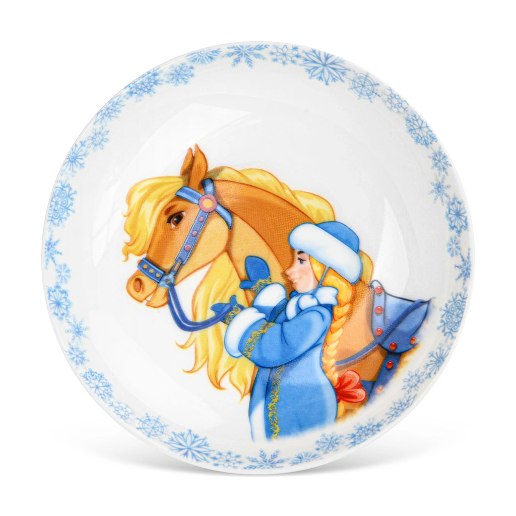 Тарелка 10 см «С Новым годом!» от Fissman - крошечное чудо в стиле советской новогодней сказки, которое украсит даже самый маленький праздник! На её белоснежной поверхности - трогательный сюжет: Снегурочка в синей шубке и меховой шапке нежно обнимает рыжего коня. По краю - изящные снежинки, словно сошедшие со страниц любимой советской открытки.