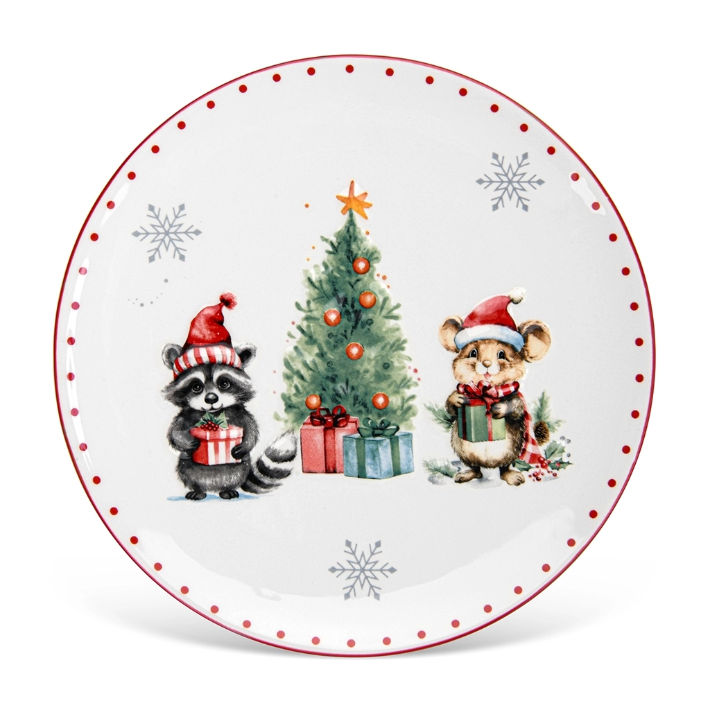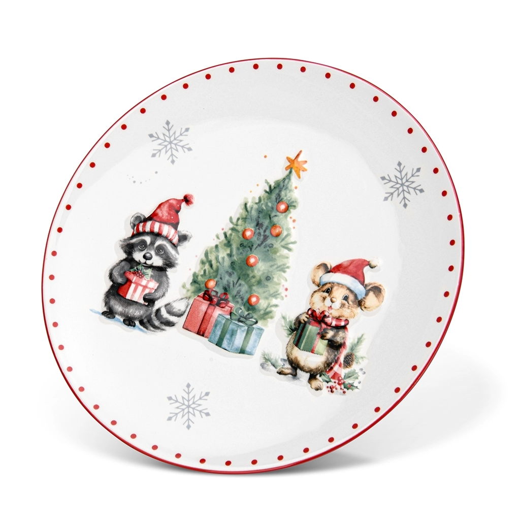 На поверхности тарелки - объёмные изображения милых зверушек в новогодних шапках, ёлки и подарков. Рельеф создаёт эффект «живого» рисунка, который ощущается пальцами и радует глаз при каждом использовании. Дополняют композицию снежинки и красный бордюр -символы зимнего праздника.