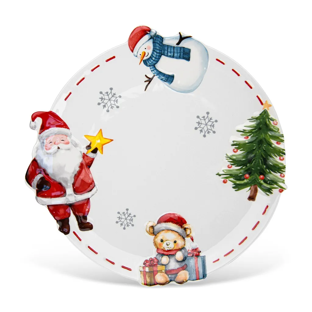 На поверхности тарелки расположены объёмные новогодние изображения, которые выступают за край тарелки, создавая динамичный визуальный эффект. Красный пунктирный контур по краю и снежинки гармонично дополняют композицию, усиливая ощущение зимней атмосферы.