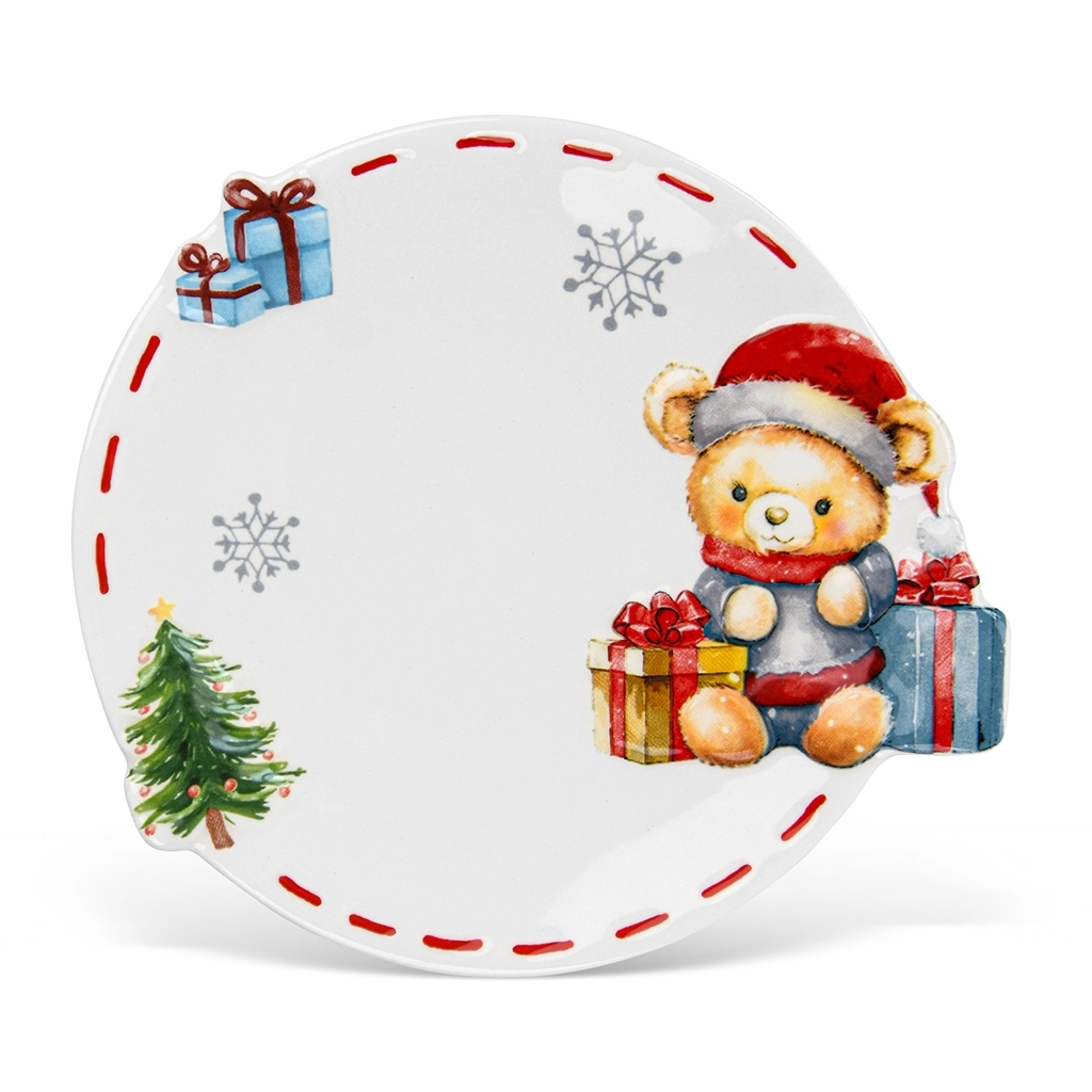 На поверхности - объёмные новогодние мотивы: медвежонок с подарками, ёлка и снежинки. Особенность дизайна - изображения частично выходят за пределы края тарелки, создавая эффект «выхода из плоскости» и усиливая визуальное восприятие. Такой подход делает каждую тарелку уникальной и привлекательной даже с расстояния.