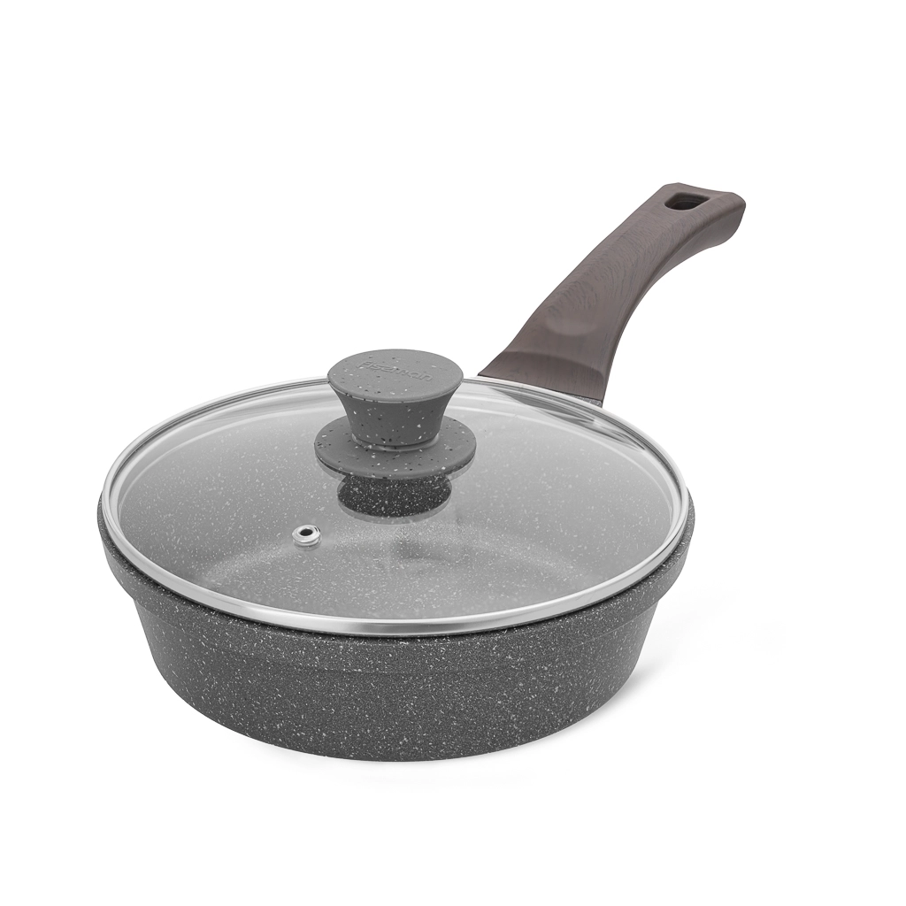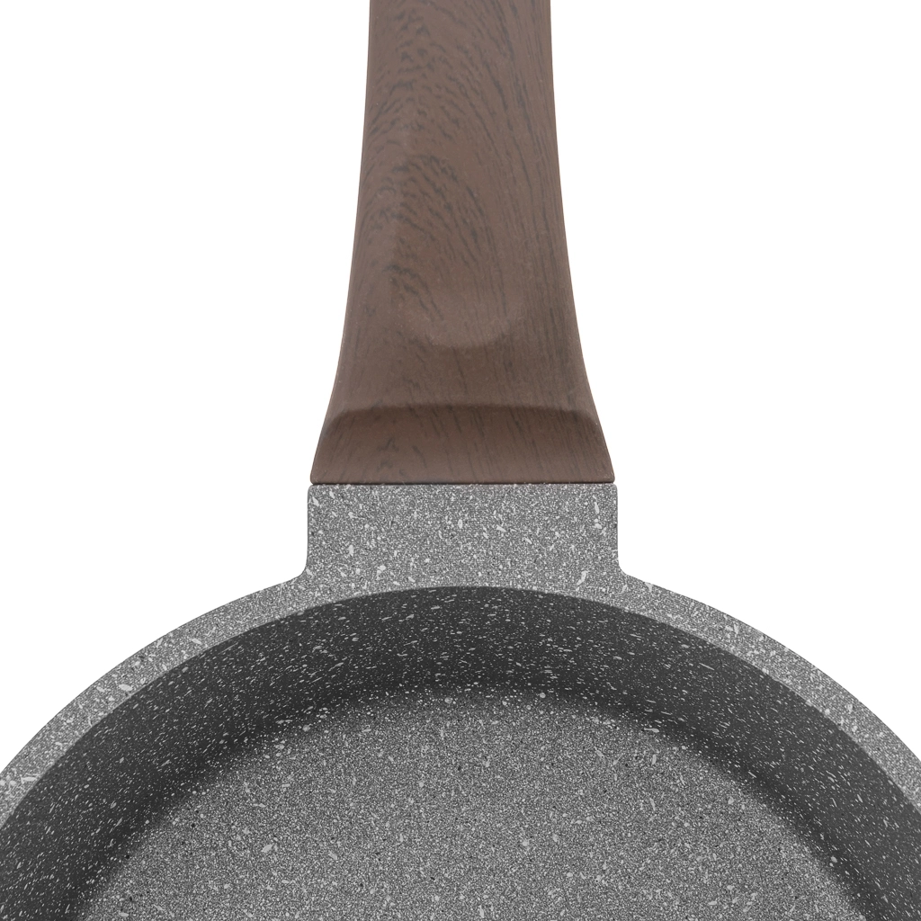 Ручки выполнены под дерево с мягким покрытием soft-touch, что обеспечивает удобство использования, приятные тактильные ощущения, предотвращает скольжение и нагрев. В комплект входит крышка, что делает использование ещё более удобным.