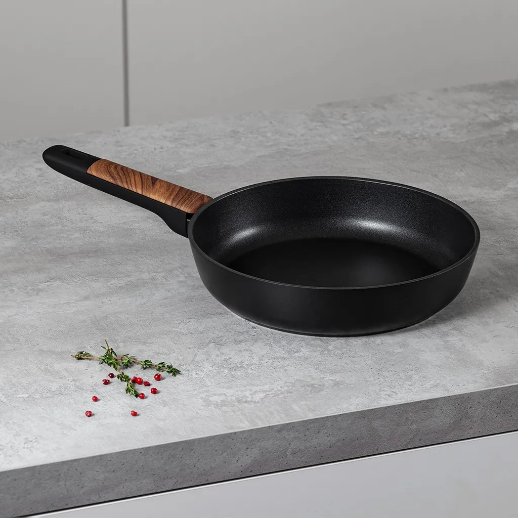 • Бакелитовые ручки с эффектом soft-touch и силиконовыми вставками, выполненные в благородном оттенке ‘под дерево’, приятны на ощупь, не скользят в руках, не нагреваются во время готовки.