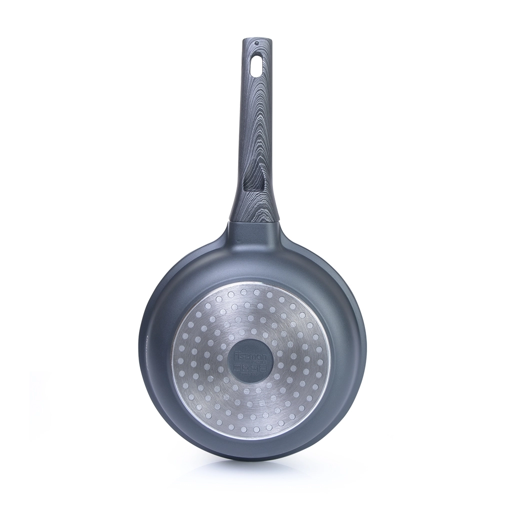 • Бакелитовые ручки с эффектом soft-touch и силиконовыми вставками, выполненные в благородном сером оттенке ‘под дерево’, приятны на ощупь, не скользят в руках, не нагреваются во время готовки.