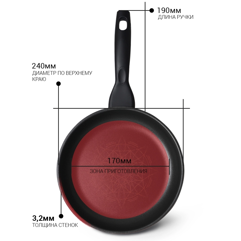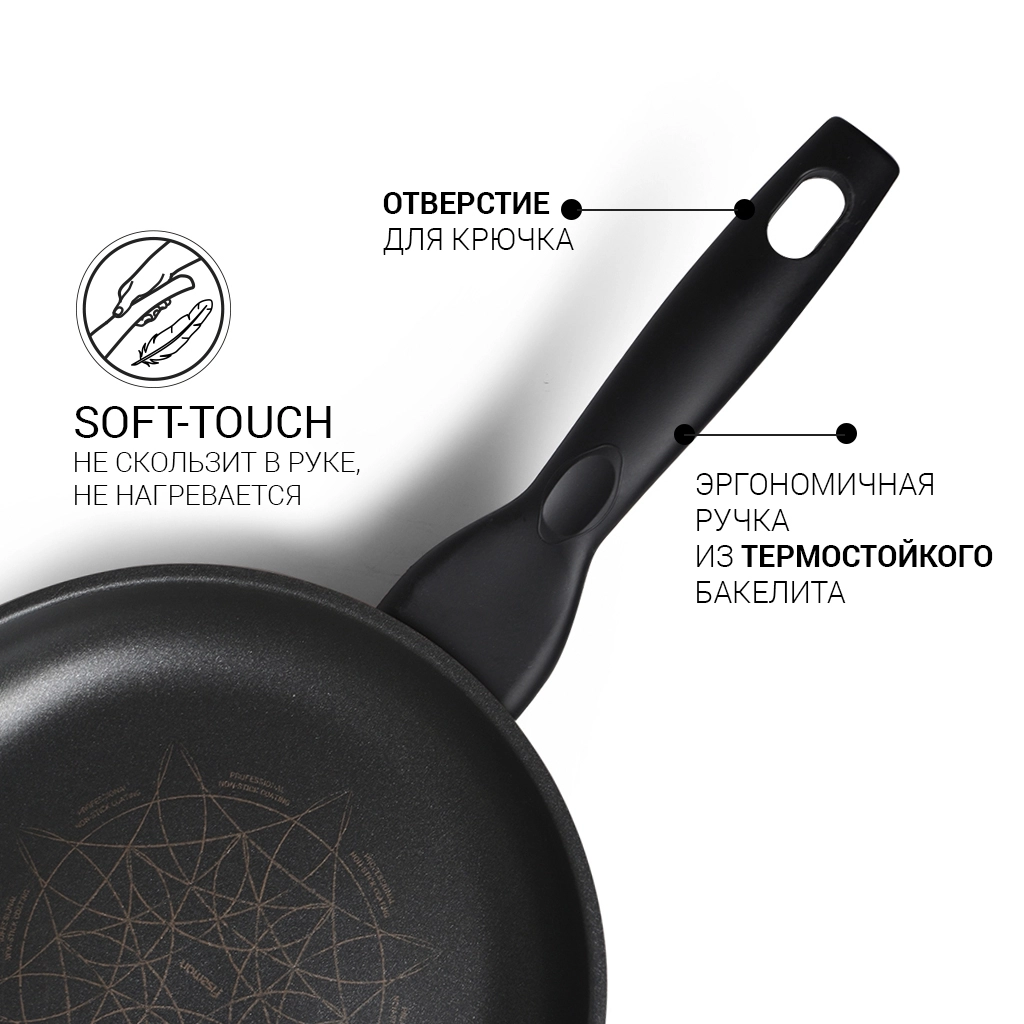 • Бакелитовая ручка с soft-touch покрытием удобна в использовании, приятна на ощупь, не скользит, не нагревается.