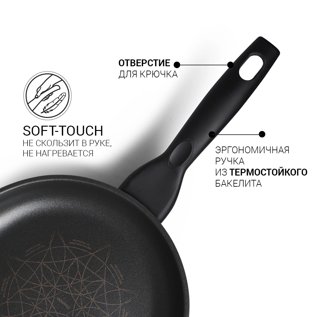 • Бакелитовая ручка с soft-touch покрытием удобна в использовании, приятна на ощупь, не скользит, не нагревается.