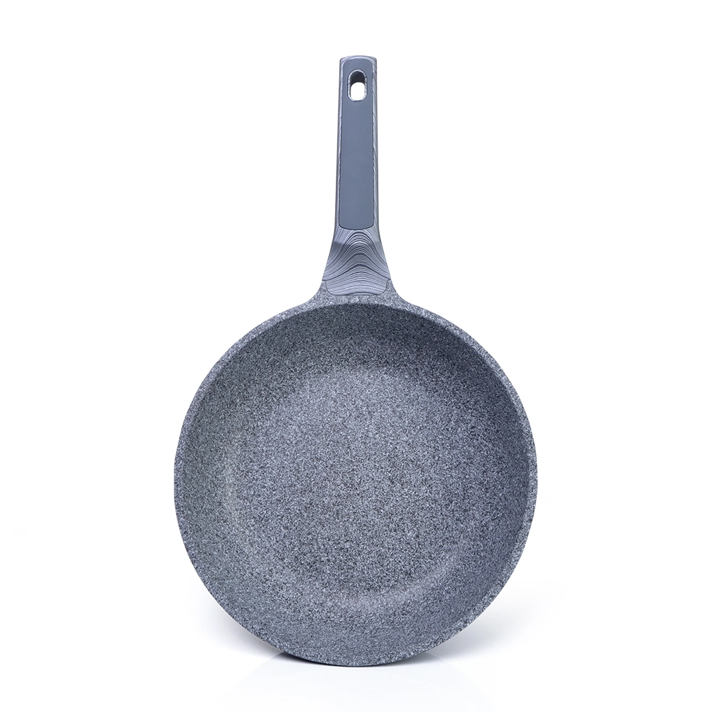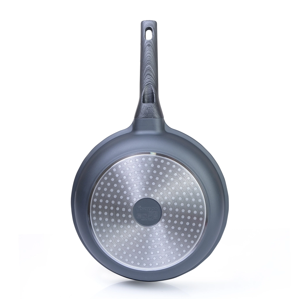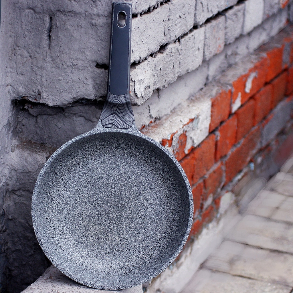 • Бакелитовые ручки с эффектом soft-touch и силиконовыми вставками, выполненные в благородном сером оттенке ‘под дерево’, приятны на ощупь, не скользят в руках, не нагреваются во время готовки.