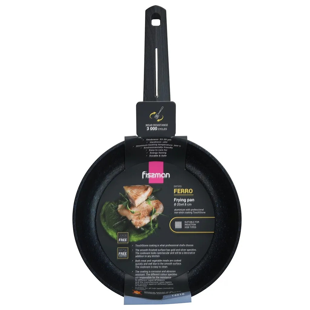 Антипригарная сковорода FERRO диаметром 20 см - это компактный и надёжный инструмент для вашей кухни. Благодаря прочному корпусу и современному антипригарному покрытию она идеально подходит для приготовления завтраков, гарниров и порционных блюд без лишних усилий.