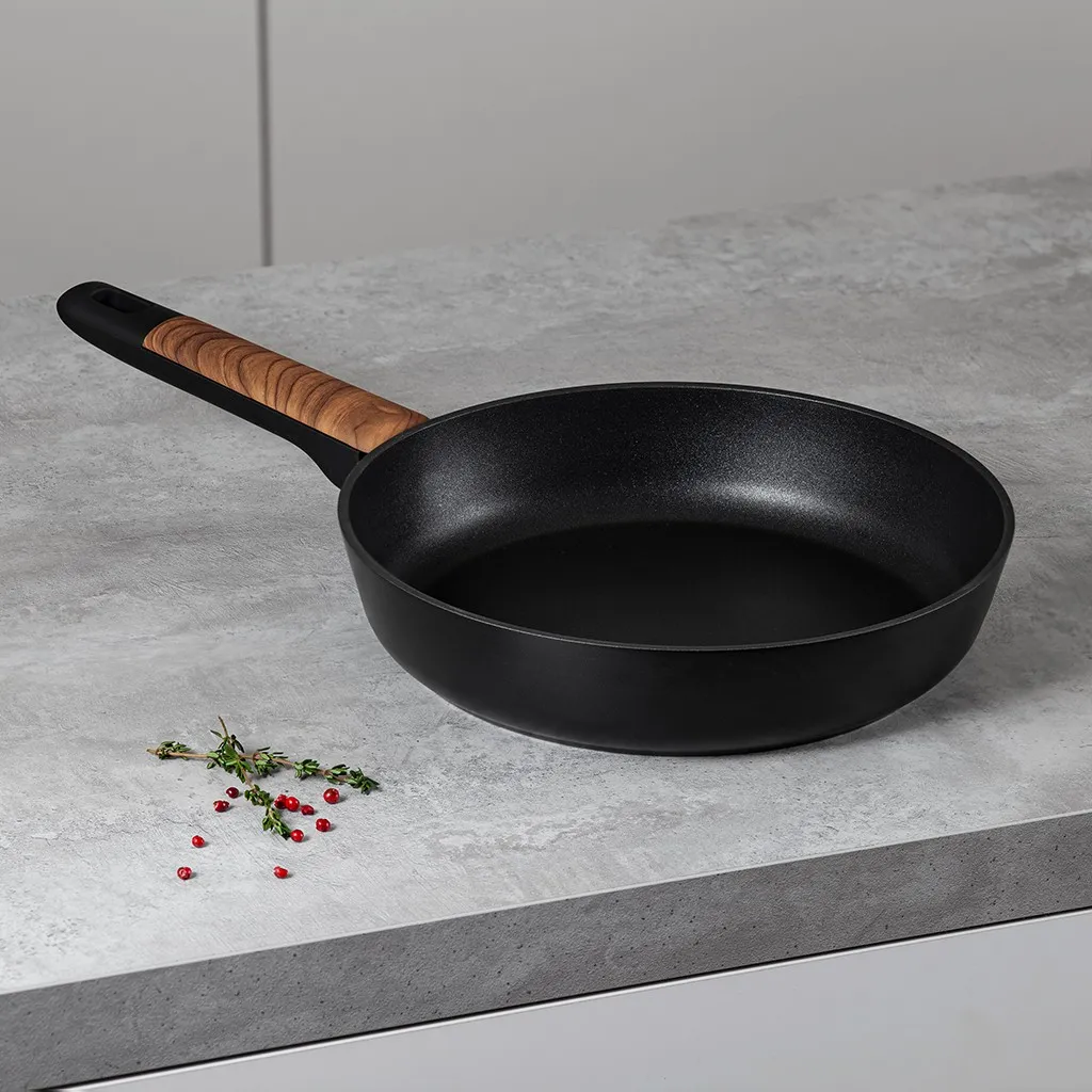 • Бакелитовые ручки с эффектом soft-touch и силиконовыми вставками, выполненные в благородном оттенке ‘под дерево’, приятны на ощупь, не скользят в руках, не нагреваются во время готовки.