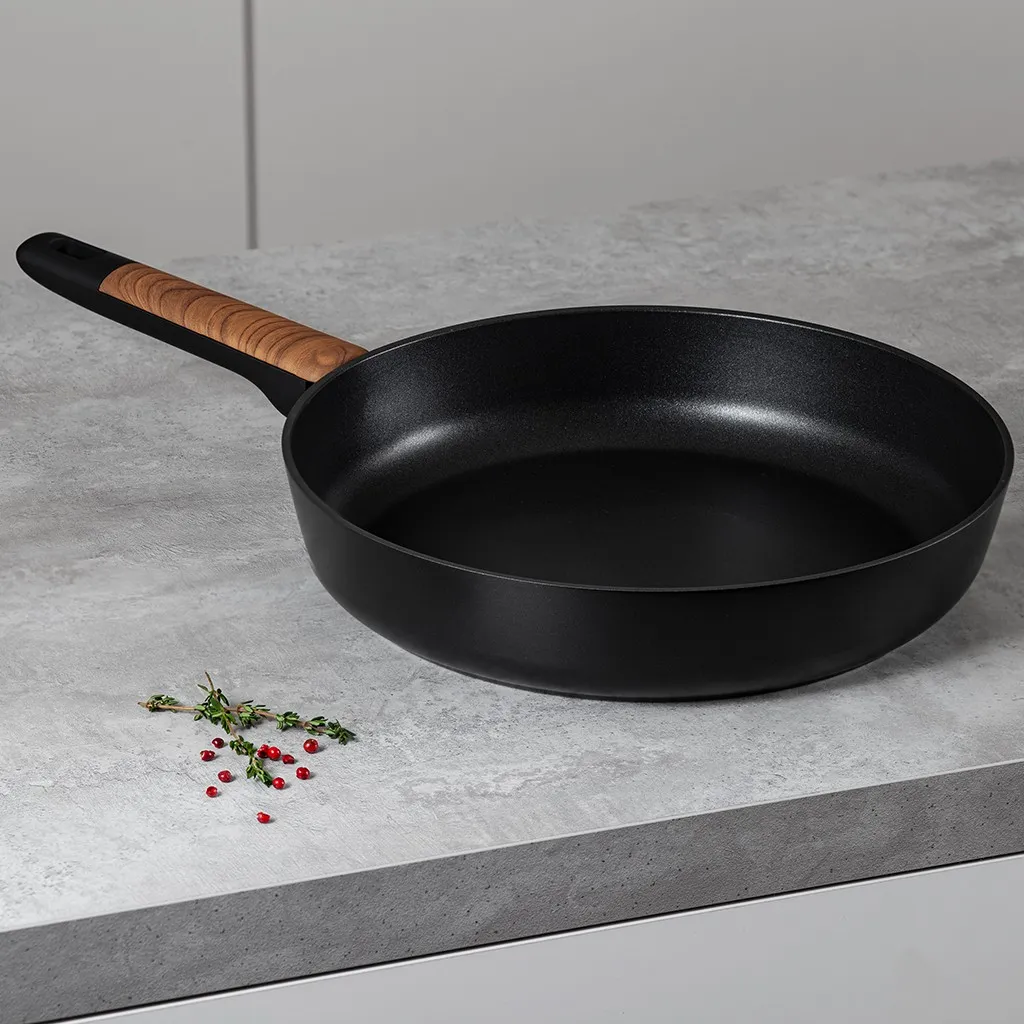 • Бакелитовые ручки с эффектом soft-touch и силиконовыми вставками, выполненные в благородном оттенке ‘под дерево’, приятны на ощупь, не скользят в руках, не нагреваются во время готовки.