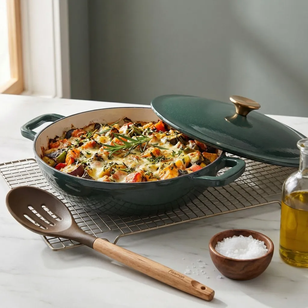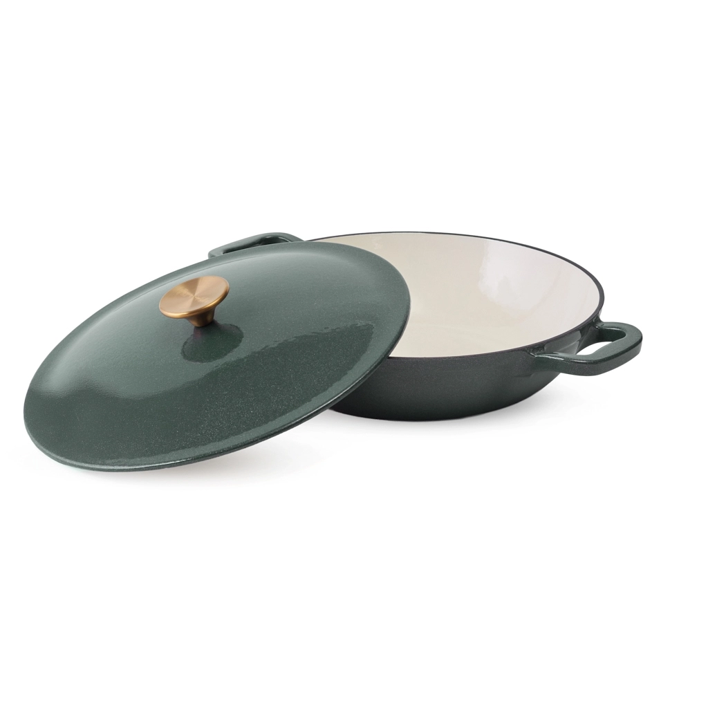 Ключевые преимущества: https://fissman.ru/catalog/skovorody/soteyniki/soteyniki-3-l/zharovnya-28-sm-3-l-emalirovannyy-chugun-le-mans-green/