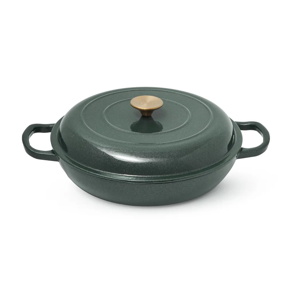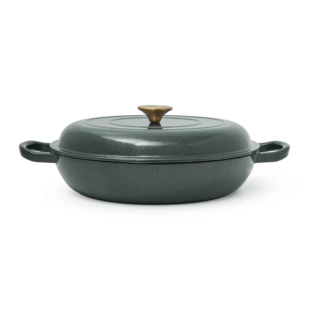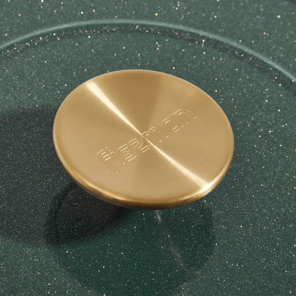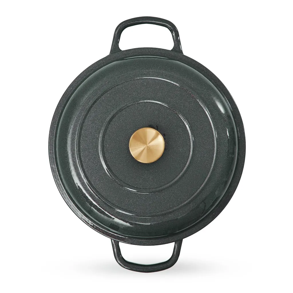 - Удобство и стиль: широкие чугунные ручки по бокам обеспечивают надёжный и комфортный захват. Ручка крышки с отделкой под матовое золото добавляет стильный акцент.