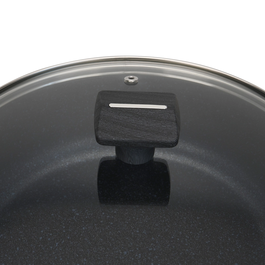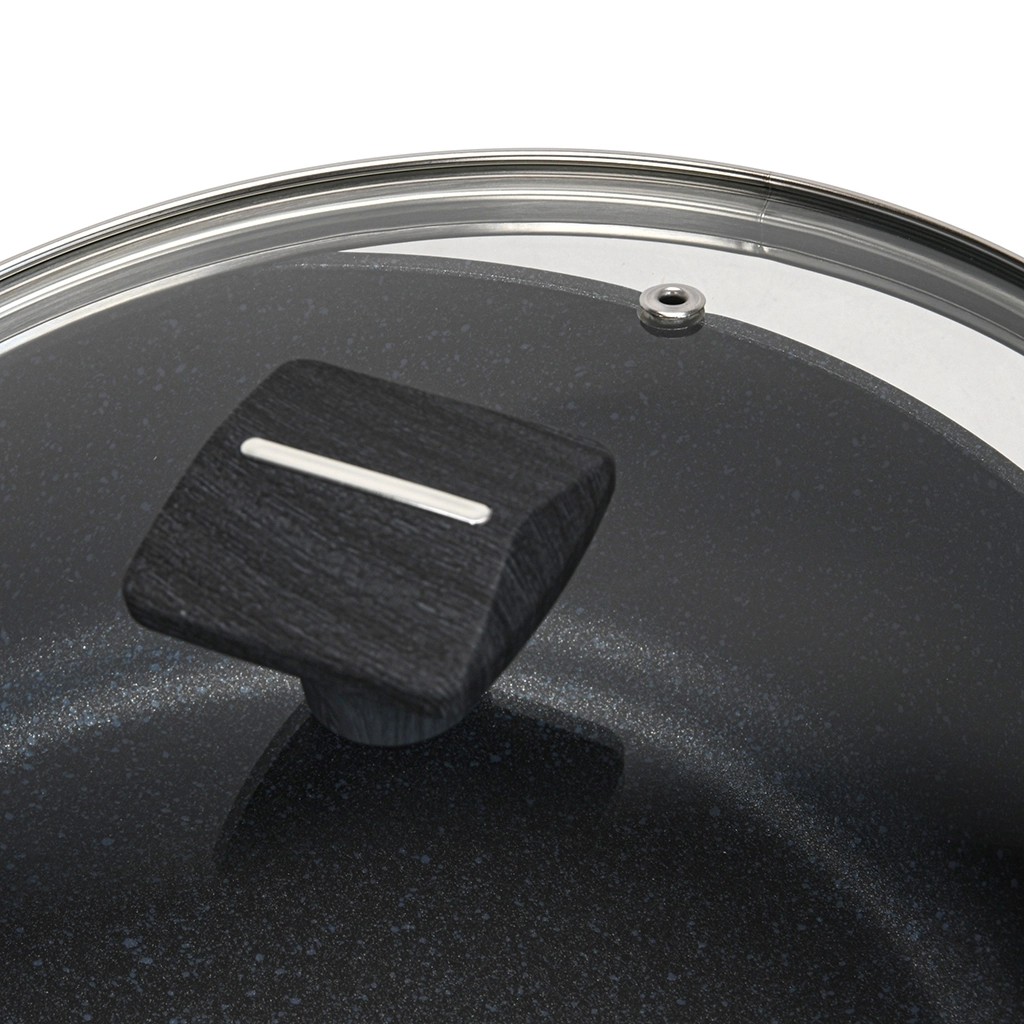• Прозрачная стеклянная крышка с паровыпуском позволяет наблюдать за готовностью пищи, не открывая посуду, тем самым, исключая попадания брызг на кожу и одежду.
